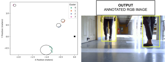 The LiDAR detects human legs within a 4-meter range(after background subtraction), using a combination of density-based clustering and least-squares based circle fitting. Clustering is performed to group points which are proximate to each other and these clusters are then fit into a circle using least squares. If the curvature of the circle is within a set threshold the cluster is considered a detection of a human leg. As this is a geometry based method, shapes which are similar to a human leg are falsely detected. Yolo-v4 based camera detection has been shown to give quite accurate detections of humans but the detections are with respect to the image. Therefore we leverage the accuracy of the Yolo model to remove false detections from the lidar detections.